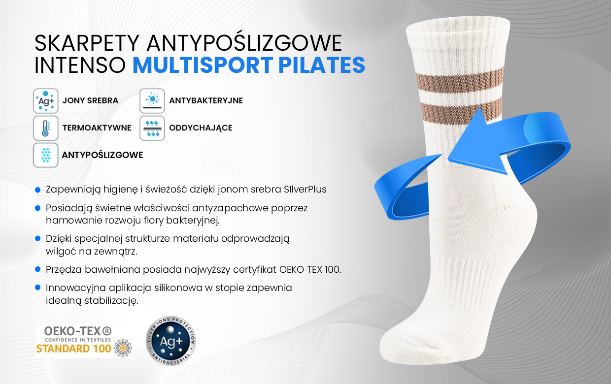 Specjalnie zaprojektowana strefa antypoślizgowa pod stopą wzmacnia stabilizację podczas ćwiczeń.Idealne do uprawiania pilates, fitness, sportów siłowych, wytrzymałościowych oraz każdej aktywności fizycznej. Zawartość jonów srebra Silverplus zapewnia właściwości antybakteryjne, utrzymanie świeżości oraz pomaga regulować temperaturę ciała.