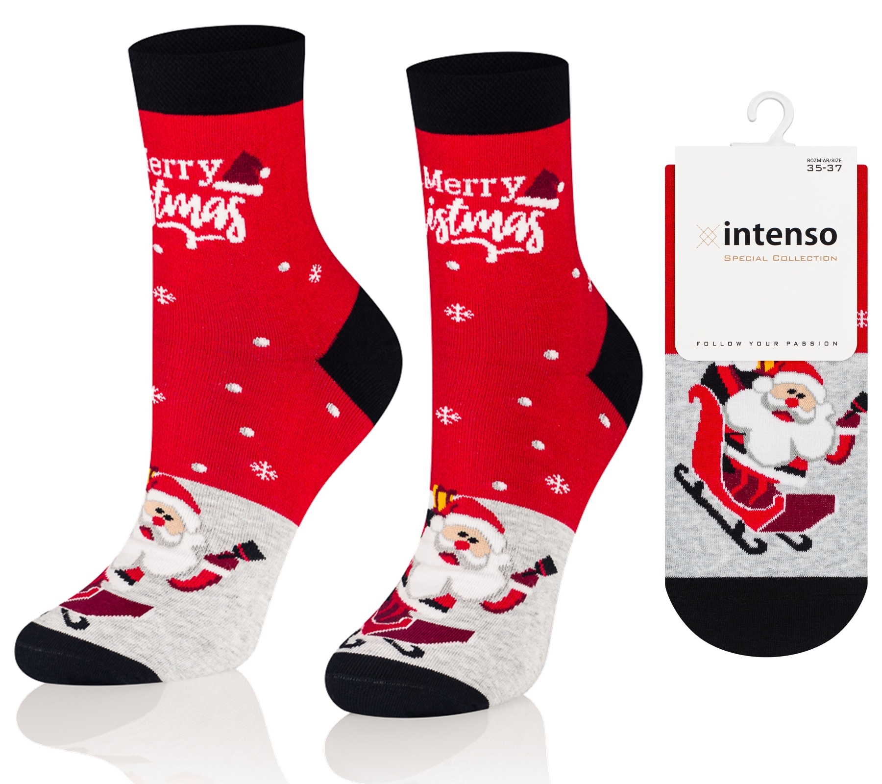 Oferujemy szeroką paletę kolorów i wzorów w renifery, mikołaje, oraz symbole zimowe i świąteczne, które z pewnością przypadną do gustu nawet najbardziej wymagającym klientom. Nasze skarpetki będą również świetnym pomysłem na prezent, który wprowadzi Cię w magiczny klimat świąt. Skarpety Intenso od początku do końca zaprojektowane i produkowane są produkowane w Polsce.