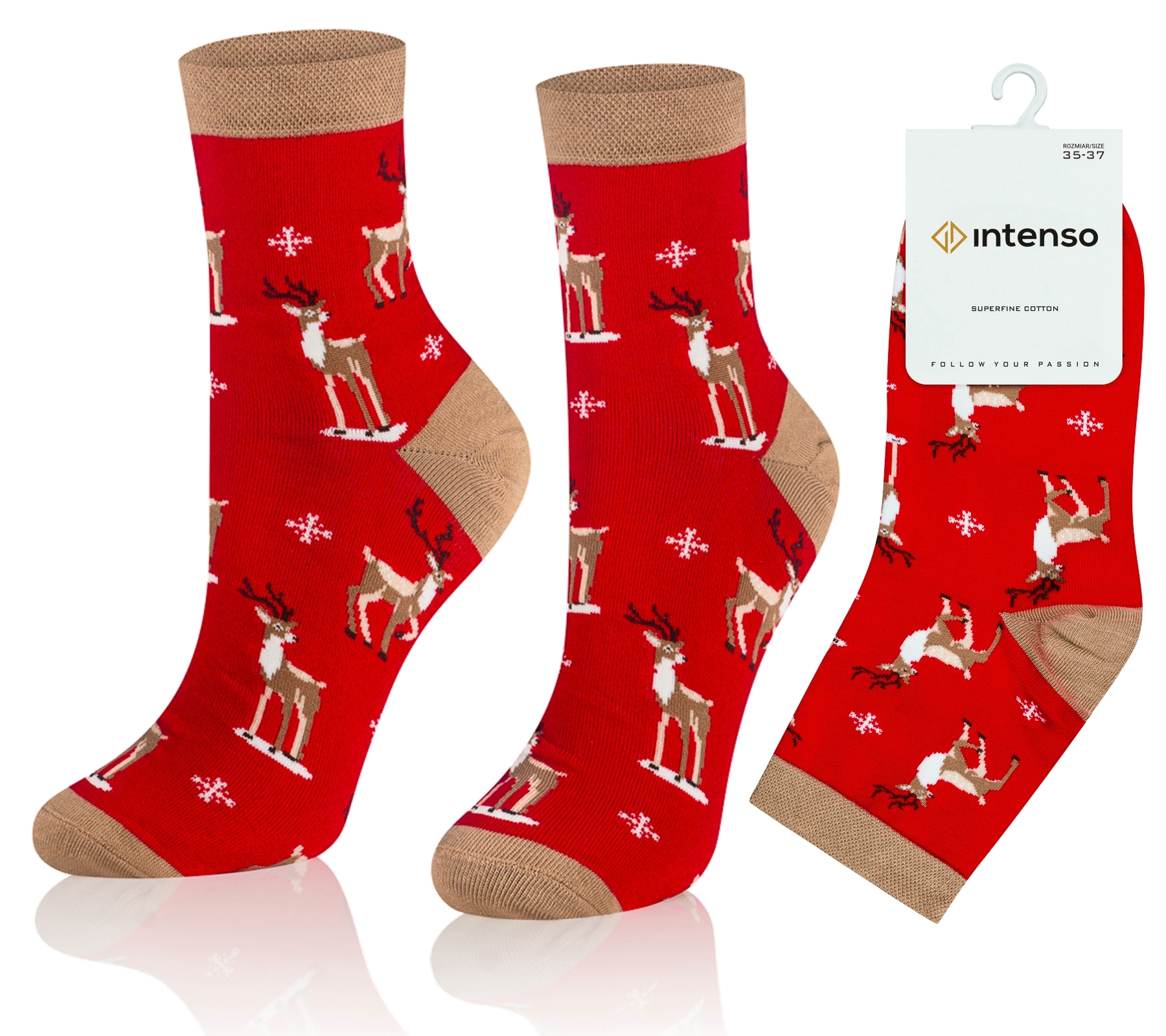 Skarpetki w świąteczne wzory wykonane z najwyższej jakości bawełny czesanej z nowej kolekcji Intenso Special Collection 0365. Skarpetki damskie Intenso z kolekcji świątecznej wyprodukowane przy użyciu nowoczesnych technologii, przy współudziale blogerów modowych i influencerów.