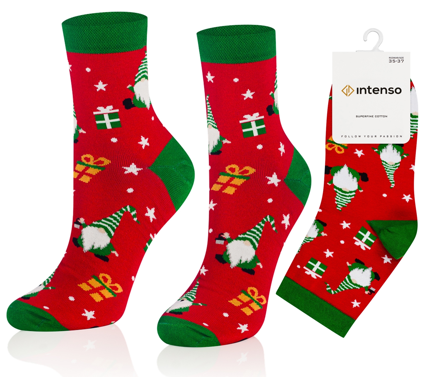 Oferujemy szeroką paletę kolorów i wzorów w renifery, mikołaje, oraz symbole zimowe i świąteczne, które z pewnością przypadną do gustu nawet najbardziej wymagającym klientom. Nasze skarpetki będą również świetnym pomysłem na prezent, który wprowadzi Cię w magiczny klimat świąt. Skarpety Intenso od początku do końca zaprojektowane i produkowane są produkowane w Polsce.