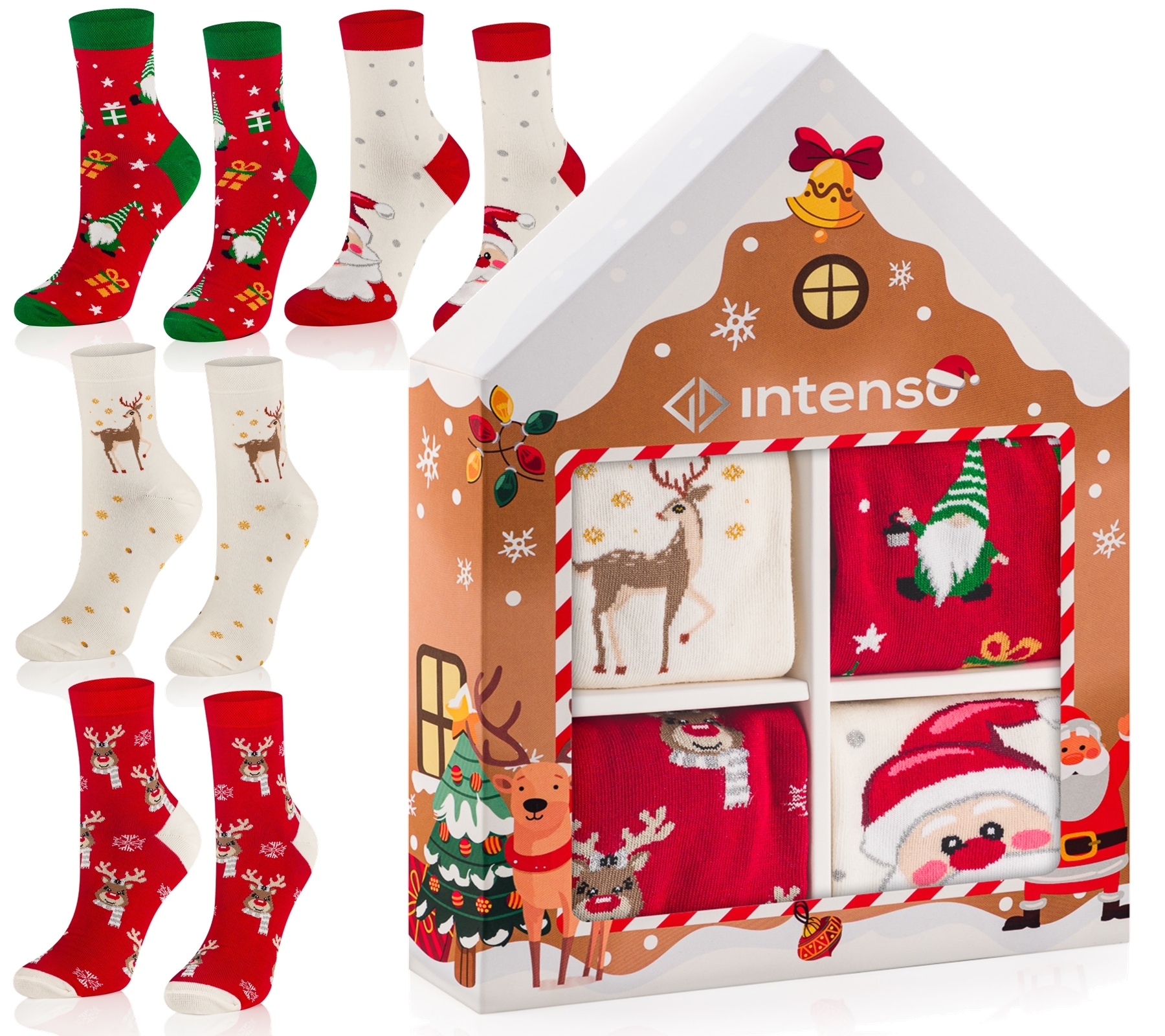 Nasze skarpetki będą również świetnym pomysłem na prezent, który wprowadzi Cię w magiczny klimat świąt. Zapakowane w ekskluzywne, świąteczne pudełko prezentowe Intenso. Skarpety Intenso od początku do końca zaprojektowane i produkowane są produkowane w Polsce.