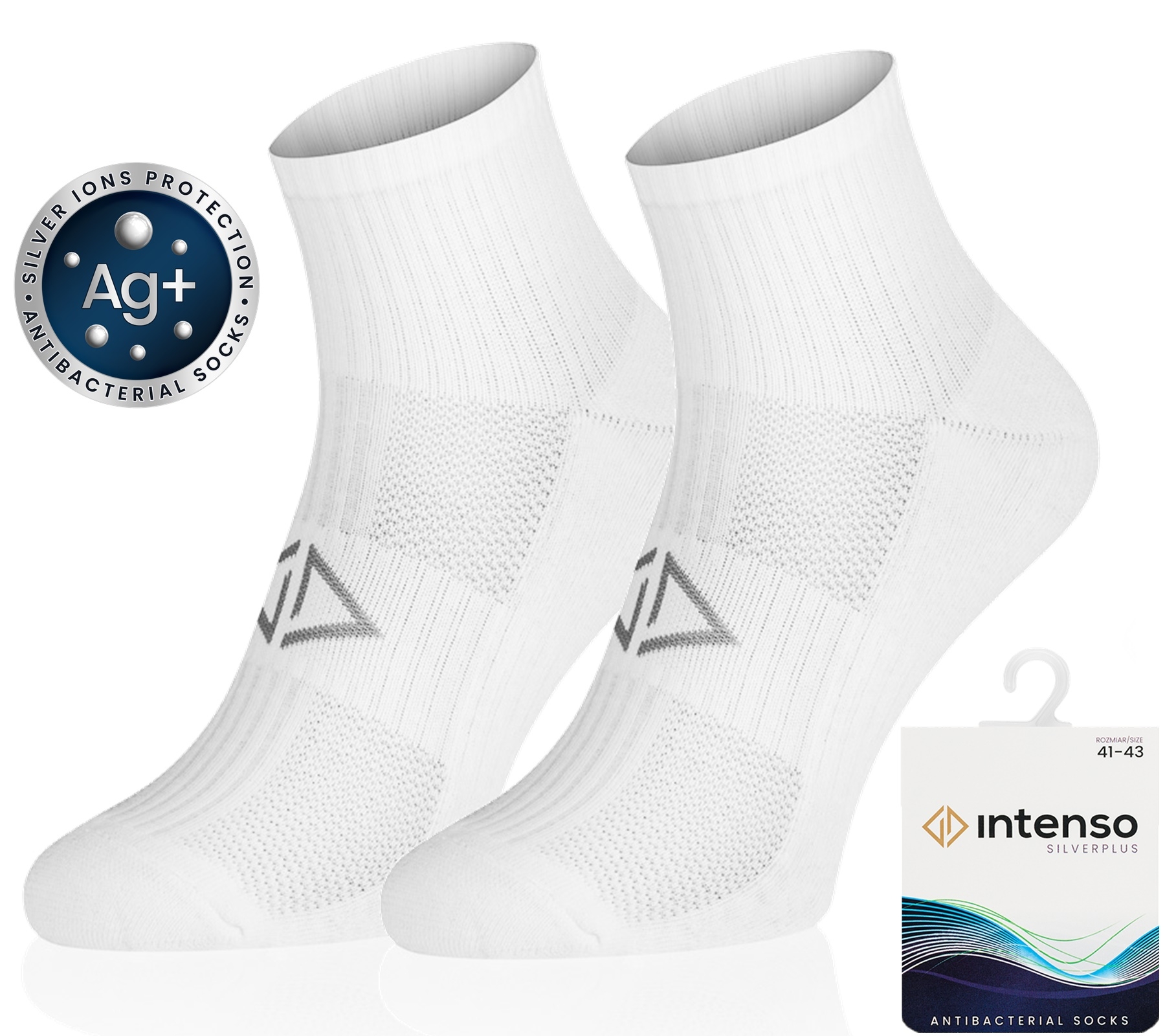 Intenso Silverplus – Nowa kolekcja krótkich skarpetek sportowych antybakteryjnych z jonami srebra. Posiadają właściwości antyzapachowe, antybakteryjne i termoaktywne. Dzięki zawartości jonów srebra zapobiegają rozwojowi flory bakteryjnej i pozostawiają skórę suchą i świeżą przez długi czas.