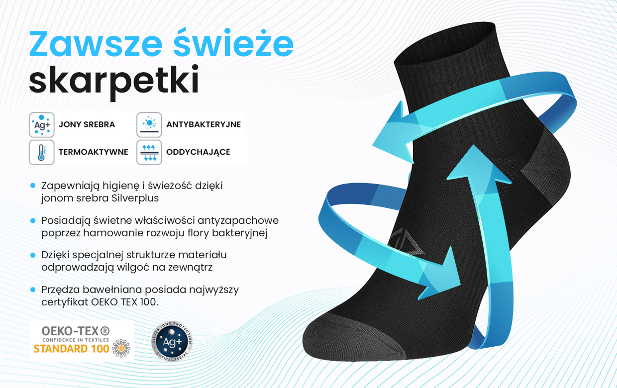 Intenso Silverplus – Nowa kolekcja skarpet antybakteryjnych z jonami srebra. Posiadają właściwości antyzapachowe, antybakteryjne i termoaktywne. Dzięki zawartości jonów srebra zapobiegają rozwojowi flory bakteryjnej i pozostawiają skórę suchą i świeżą przez długi czas.