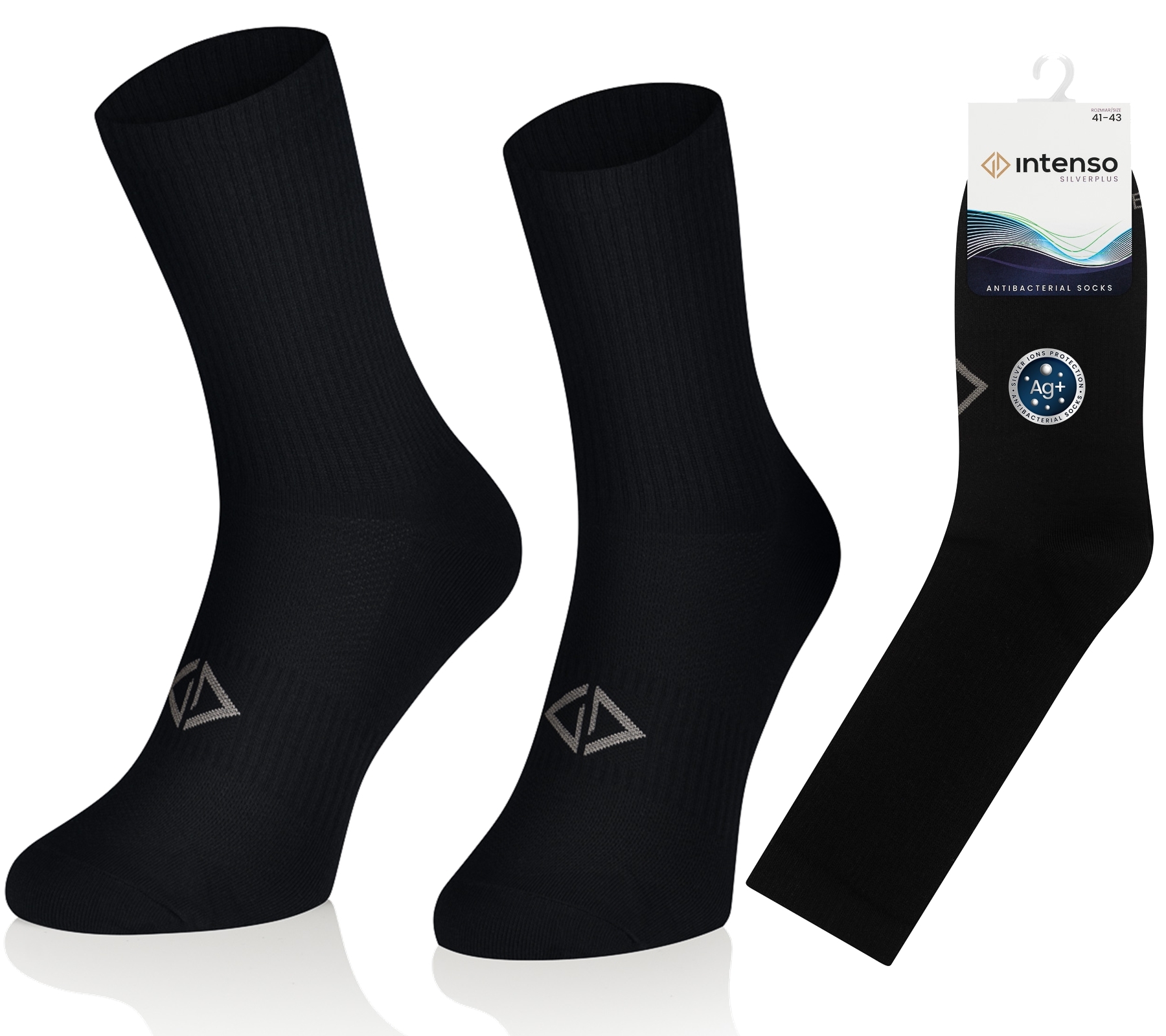 Intenso Silverplus – Nowa kolekcja sportowych skarpet antybakteryjnych z jonami srebra. Posiadają właściwości antyzapachowe, antybakteryjne i termoaktywne. Dzięki zawartości jonów srebra zapobiegają rozwojowi flory bakteryjnej i pozostawiają skórę suchą i świeżą przez długi czas.