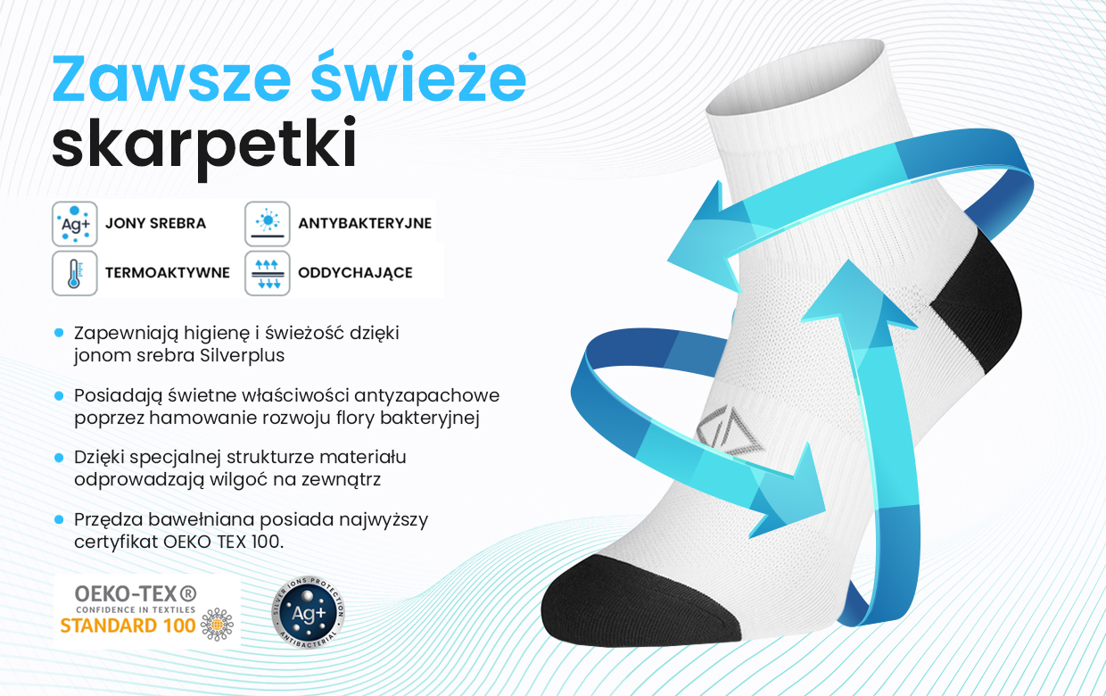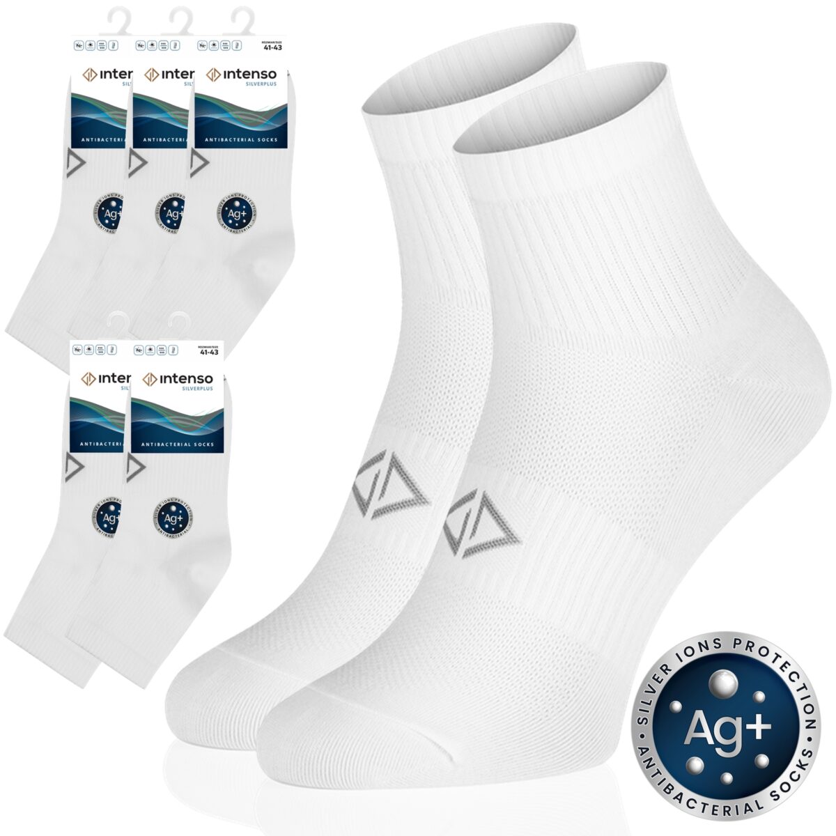 Intenso Silverplus – Nowa kolekcja skarpet antybakteryjnych z jonami srebra. Posiadają właściwości antyzapachowe, antybakteryjne i termoaktywne. Dzięki zawartości jonów srebra zapobiegają rozwojowi flory bakteryjnej i pozostawiają skórę suchą i świeżą przez długi czas.