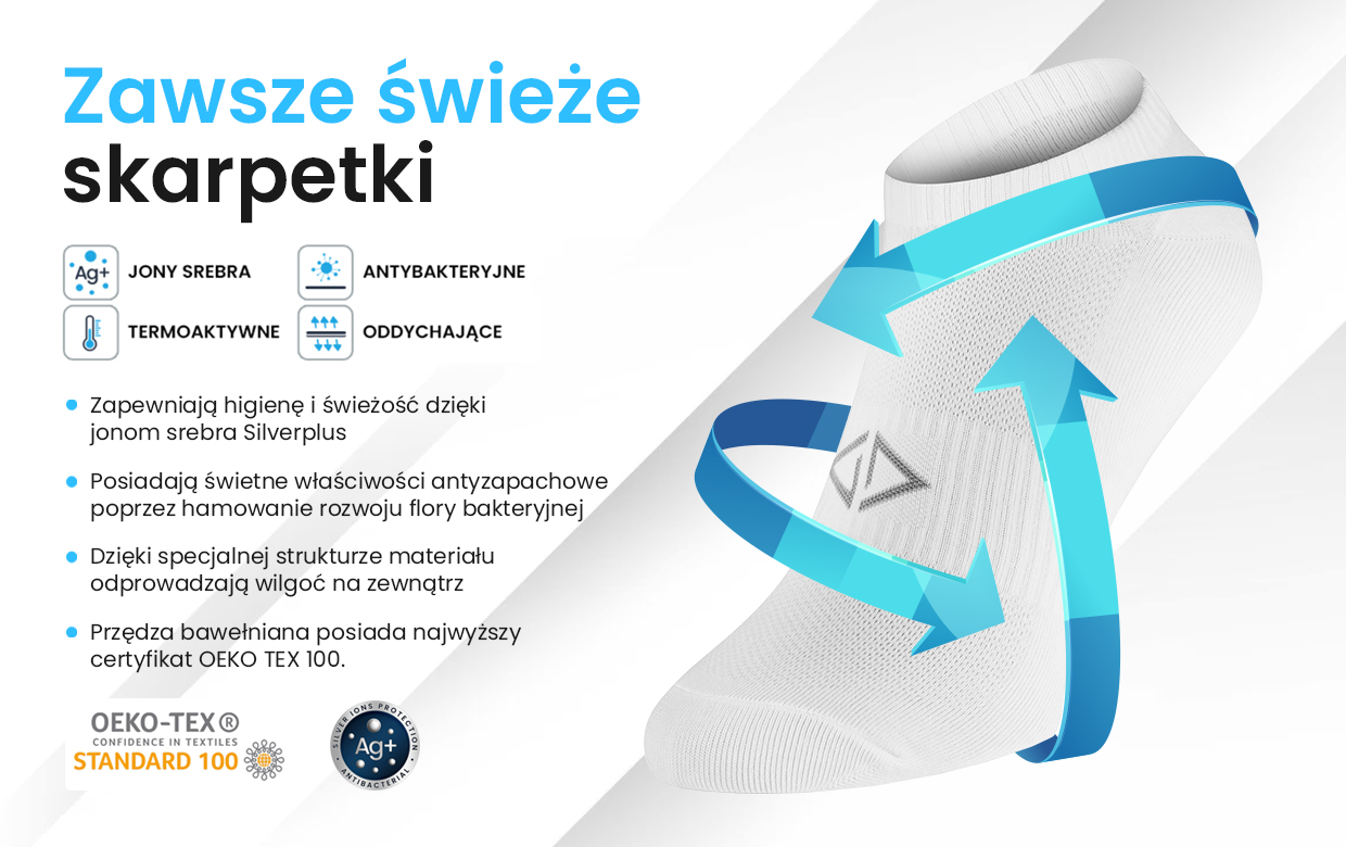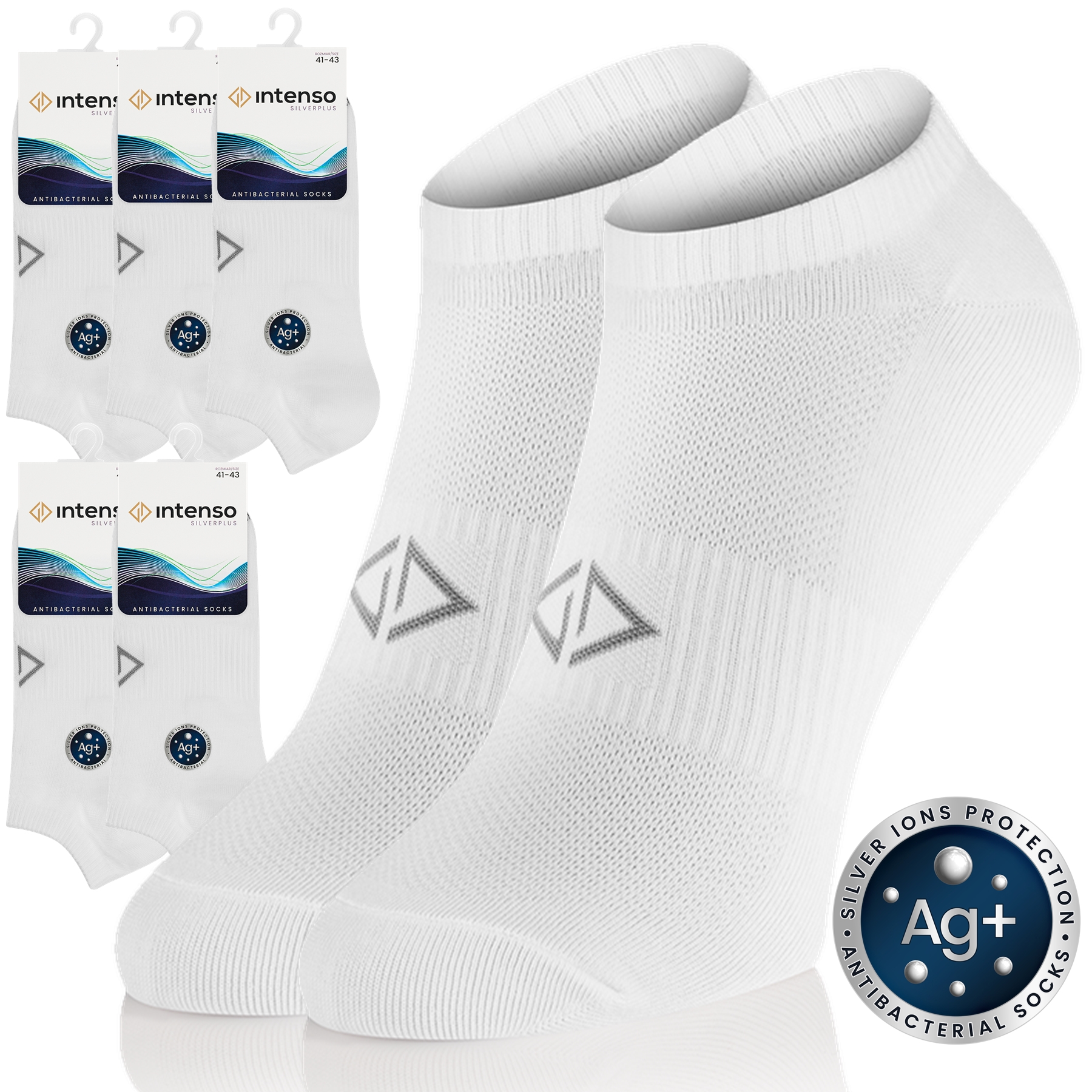 Intenso Silverplus – Nowa kolekcja skarpet antybakteryjnych z jonami srebra. Posiadają właściwości antyzapachowe, antybakteryjne i termoaktywne. Dzięki zawartości jonów srebra zapobiegają rozwojowi flory bakteryjnej i pozostawiają skórę suchą i świeżą przez długi czas.