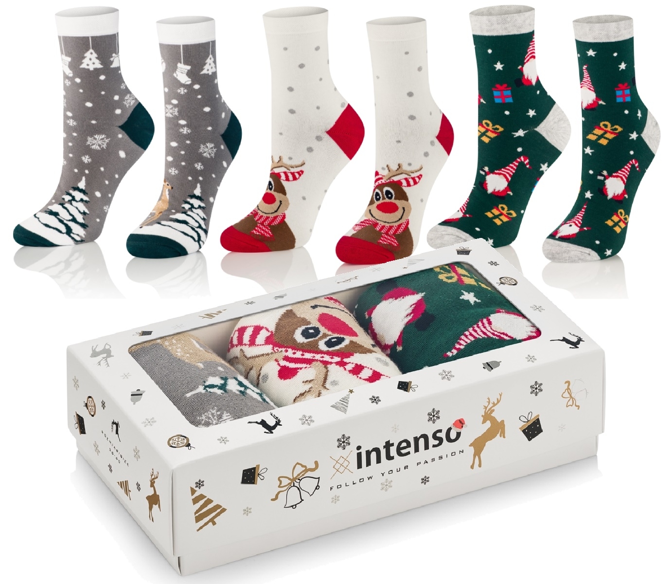 Skarpety z kolekcji świątecznej wyprodukowane z najwyższej jakości surowców przy użyciu nowoczesnych technologii. Zapakowane w efektowne, prezentowe pudełko Intenso.