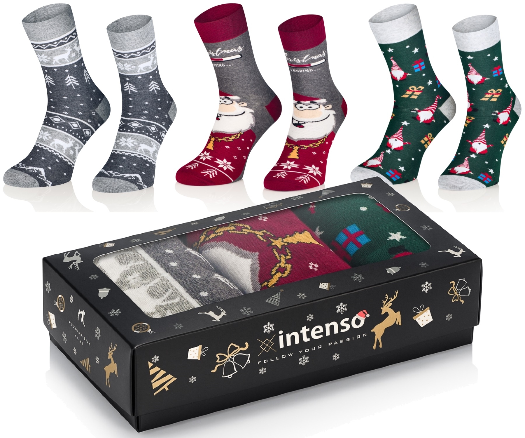 Nasze skarpetki będą również świetnym pomysłem na prezent, który wprowadzi Cię w magiczny klimat świąt. Zapakowane w ekskluzywne, świąteczne pudełko prezentowe Intenso. Skarpety Intenso od początku do końca zaprojektowane i produkowane są produkowane w Polsce.