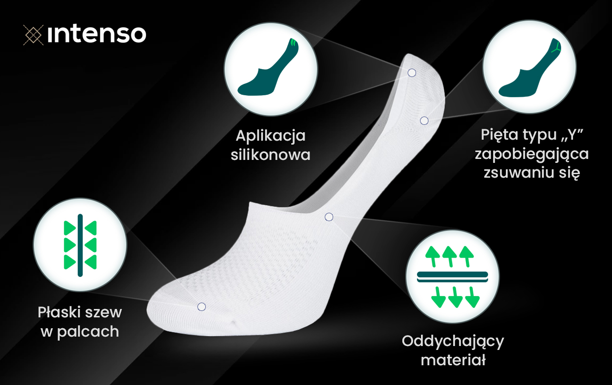 Eleganckie microstopki Intenso typu mokasyn zostały zaprojektowane z myślą o wiosenno-letnim obuwiu o głębszym wycięciu. Niewidoczny profil perfekcyjnie układa się w bucie, pozostając całkowicie dyskretnym nawet przy klasycznych mokasynach czy loafersach.